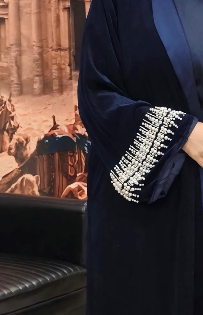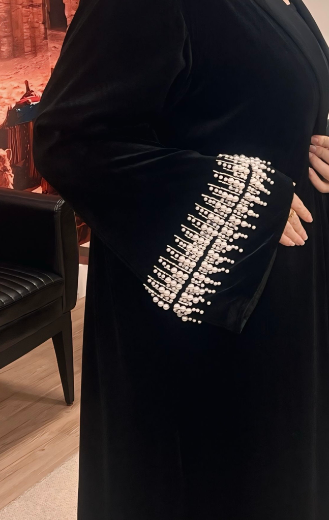 Beaded Velvet Abaya | This abaya is crafted from luxurious velvet with a soft satin lining. Adorned with pearl beading, it combines rich texture with stunning detail for an elegant look.